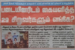 இறுதி யுத்தத்தில் இராணுவத்திடம் கையளிக்கப்பட்ட 29 சிறுவர்களின் நிலை என்ன? இறுதி யுத்தத்தில் பெற்றோரால் இராணுவத்திடம் கையளிக்கப்பட்ட 29 சிறுவர்களின் நிலை தொடர்பில் சர்வதேசம் மௌனம் காக்க கூடாது என வடக்கு கிழக்கு வழிந்து காணாமல் ஆக்கப்பட்ட உறவுகளின் சங்க பொதுச்செயலாளர் லீலாவதி ஆனந்த... Read more »