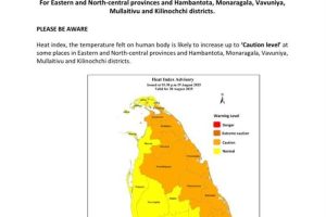 இலங்கையின் பல பாகங்களுக்கு வெப்ப எச்சரிக்கை இலங்கையின் கிழக்கு மற்றும் வடமத்திய மாகாணங்கள், அத்துடன் அம்பாந்தோட்டை, மொனராகலை, வவுனியா, முல்லைத்தீவு மற்றும் கிளிநொச்சி ஆகிய மாவட்டங்களுக்கு வளிமண்டலவியல் திணைக்களம் வெப்ப வானிலை தொடர்பில் எச்சரிக்கை விடுத்துள்ளது. திணைக்களத்தின்படி, இந்த 10 மாவட்டங்களுக்கும் நாளை... Read more »