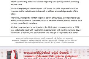 காணாமல் போனோர் குடும்பங்கள் ஏமாற்றம்: 35வது நினைவேந்தலுக்கு முன்னதாக ஜனாதிபதியின் மௌனம் காணாமல் போனவர்களின் 35வது வருடாந்த நினைவேந்தல் நிகழ்வு அக்டோபர் 27 அன்று சீதுவ, ரத்தொலுவவில் உள்ள காணாமல் போனவர்களுக்கான நினைவுத்தூபியில் நடைபெறவுள்ள நிலையில், ஜனாதிபதி அனுர குமார திஸாநாயக்காவின் தொடர்ச்சியான மௌனம்... Read more »