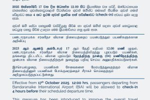 கட்டுநாயக்க விமான நிலையத்தில் பயணிகளுக்கு புதிய வசதி: விமானப் புறப்பாட்டுக்கு 4 மணி நேரம் முன்னரே பயணப் பதிவு (Check-in) செய்யலாம் கட்டுநாயக்க, பண்டாரநாயக்க சர்வதேச விமான நிலையத்தில் (BIA) இருந்து புறப்படும் பயணிகள், தங்கள் விமானப் பயண நேரம் திட்டமிடப்பட்ட நேரத்திற்கு நான்கு... Read more »