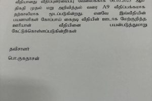 கைதடி ஊரியான் வீதி புனரமைப்புக்காக தற்காலிகமாக மூடப்படுகிறது..! கைதடி ஊரியான் வீதியானது வீதி புனரமைப்பு பணிகளுக்காக எதிர்வரும் 06.10.2025 தொடக்கம் மறுஅறிவித்தல் வரை தற்காலிகமாக மூடப்படவிருப்பதாக சாவகச்சேரிப் பிரதேசசபைத் தவிசாளர் பொ.குகதாசன் அறிவித்துள்ளார். இது தொடர்பாக அவர் மேலும் தெரிவிக்கையில்; வடமாகாணசபைக்கு அருகாமையில் செல்லும்... Read more »
