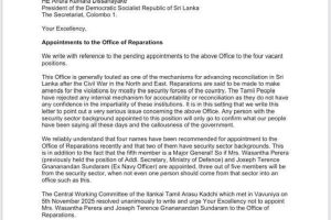 2025 நவம்பர் 6 மாண்புமிகு அனுர குமார திஸாநாயக்க இலங்கை சனநாயக சோசலிசக் குடியரசின் ஜனாதிபதி செயலகம் கொழும்பு 1. மாண்புமிகு ஜனாதிபதி அவர்களே இழப்பீட்டுக்கான அலுவலகத்திற்கான நியமனங்கள் மேலே குறிப்பிடப்பட்டுள்ள இழப்பீட்டுக்கான அலுவலகத்தின் (Office of Reparations) காலியாக உள்ள நான்கு பதவிகளுக்கான... Read more »