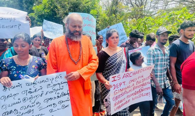 வவுனியாவில் வெடுக்குநாறிமலை ஆதி லிங்கேஸ்வரர் ஆலய நிர்வாகத்தினரின் ஏற்பாட்டில் பொலிஸாரின் அராஜகத்திற்கு எதிராகவும் தமிழருக்கான நீதிகோரியும் போராட்டம் ஒன்று முன்னெடுக்கப்பட்டுள்ளது.