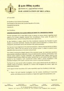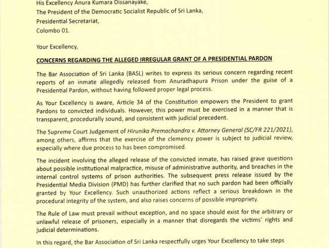 இன்று அனுப்பப்பட்ட கடிதத்தில், சரியான சட்ட நடைமுறைகளைப் பின்பற்றாமல் மன்னிப்பு வழங்கப்பட்டுள்ளதாக BASL குறிப்பிட்டுள்ளது.