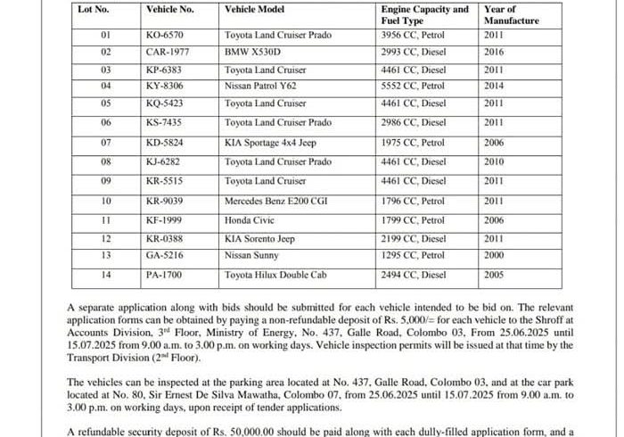 எரிசக்தி அமைச்சு: 14 சொகுசு மற்றும் பாவனையற்ற வாகனங்கள் பகிரங்க ஏலத்தில்!