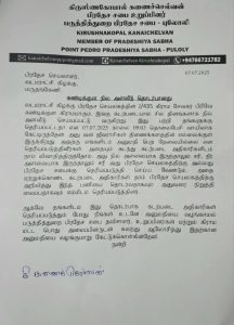 என பருத்தித்துறை பிரதேச சபை உறுப்பினர் கணைச்செல்வன் அவர்களால் பிரதேச செயலாளர் திரு.குமாரசாமி பிரபாகர் மூர்த்தி அவர்களுக்கு அனுப்பப்பட்டது