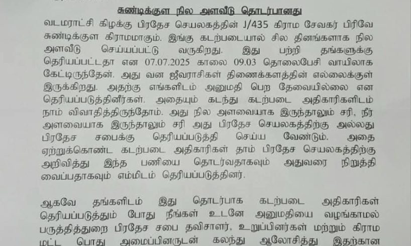 வடமராட்சி கிழக்கு பிரதேச செயலகத்தின் J/435 கிராம சேவகர் பிரிவே சுண்டிக்குள கிராமமாகும். இங்கு கடற்படையால் சில தினங்களாக நில அளவீடு செய்யப்பட்டு வருகிறது. இது பற்றி தங்களுக்கு தெரியப்படுத்தப்பட்டதா என 07.07.2025 காலை 09.03 மணிக்கு தொலைபேசி வாயிலாக கேட்டிருந்தேன். அது வன ஜீவராசிகள் திணைக்களத்தின் எல்லைக்குள் இருக்கிறது அதற்கு எங்களிடம் அனுமதி பெற தேவையில்லை என தெரியப்படுத்தினீர்கள். அதையும் கடந்து கடற்படை அதிகாரிகளிடம் நாம் விவாதித்திருந்தோம். அது நில அளவையாக இருந்தாலும் சரி, நீர் அளவையாக இருந்தாலும் சரி அது பிரதேச செயலகத்திற்கு அல்லது பிரதேச சபைக்கு தெரியப்படுத்தி செய்ய வேண்டும். அதை ஏற்றுக் கொண்ட கடற்படை அதிகாரிகள் தாம் பிரதேச செயலகத்திற்கு அறிவித்து இந்த பணியை தொடர்வதாகவும் அது வரை நிறுத்தி வைப்பதாகவும் எம்மிடம் தெரியப்படுத்தினர்.