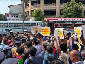 போராட்டத்தில் ஈடுபட்ட ஆர்ப்பாட்டக்காரர்கள், கோட்டை புகையிரத நிலையத்திலிருந்து முன்னோக்கி பேரணியாகச் செல்ல முயன்றவேளை, பொலிஸார் அவர்களைத் தடுத்து நிறுத்தினர். ஆர்ப்பாட்டக்காரர்கள் தங்களை முன்னோக்கிச் செல்ல அனுமதிக்குமாறு பொலிஸாரிடம் பலமுறை வேண்டுகோள் விடுத்தபோதிலும், பொலிஸார் அதற்கு அனுமதிக்கவில்லை. இதன் காரணமாக ஆர்ப்பாட்டக்காரர்கள் முன்னோக்கி நகர முற்பட்டபோது, பொலிஸார் அவர்களைத் தடுத்து நிறுத்தியதால் அப்பகுதியில் பெரும் குழப்பநிலை ஏற்பட்டது.