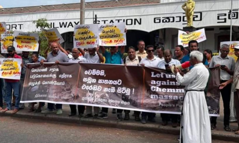 இந்த வரலாற்றுப் பின்னணியில், செம்மணி உட்பட அனைத்து மனிதப் புதைகுழிகளுக்கும் நீதிகோரி, நீதிக்கான மக்கள் சக்தி அமைப்பு கொழும்பு கோட்டை புகையிரத நிலையத்திற்கு முன்னால் போராட்டத்திற்கு ஏற்பாடு செய்திருந்தது. “புத்த தேசமா? புதைகுழிகள் தேசமா?”, “செம்மணியில் எலும்புகளாக எம்மவர்கள், சர்வதேசமே தமிழர்களை ஏமாற்றாதே!”, “யுத்த குற்றத்தின் சாட்சி செம்மணி”, “வட கிழக்கில் நில ஆக்கிரமிப்பை நிறுத்து” போன்ற வாசகங்கள் பொறிக்கப்பட்ட பதாதைகளை ஏந்தி, பெருமளவான பொதுமக்கள் போராட்டத்தில் கலந்துகொண்டனர்.
