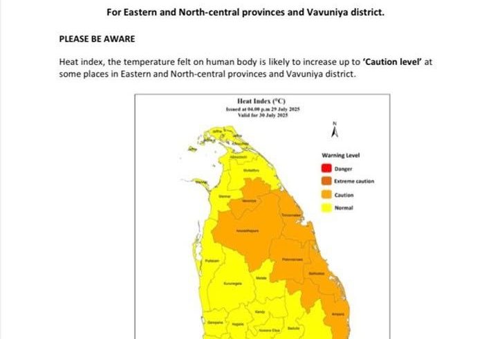 இலங்கையின் கிழக்கு மற்றும் வடமத்திய மாகாணங்கள், அத்துடன் வவுனியா மாவட்டத்திற்கு நாளை, அதாவது ஜூலை 30, 2025 முதல் வெப்பமான காலநிலைக்கான எச்சரிக்கையை வளிமண்டலவியல் திணைக்களம் வெளியிட்டுள்ளது.