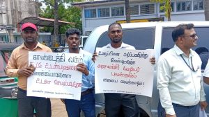ஊழியர்களின் நலனில் அக்கறை எடுக்காமை, போனஸ் குறைப்புக்கு உள்ளிட்ட பிரச்சினைகளுக்கு தீர்வைக் கோரியும் அதற்கான முயற்சிகளில் அரசின் அசமந்தப் போக்குக்கு எதிர்ப்பு தெரிவித்தும், இன்று (13.08.2025) மதியம் 12.30 மணியளவில் யாழ் மாவட்டத்தில் உள்ள இலங்கை வங்கி கிளை வலையமைப்புக்களை மூடி, அனைத்து பரிவர்த்தனைகளிலிருந்தும் விலக இலங்கை வங்கி ஊழியர் சங்கம் போராட்டம் ஒன்றை முன்னெடுத்தது.