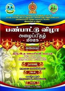 பச்சிலைப்பள்ளி பிரதேச செயலகத்தின் ஏற்பாட்டில், வடக்கு மாகாண பண்பாட்டலுவல்கள் திணைக்களத்தின் நிதி அனுசரணையுடன் மற்றும் பச்சிலைப்பள்ளி பிரதேச கலாசாரப் பேரவை இணைந்து நடாத்தும் பண்பாட்டு விழா நாளை(15.08.2025) வெள்ளிக் கிழமை காலை 9.00 மணிக்கு நடைபெறவுள்ளது.