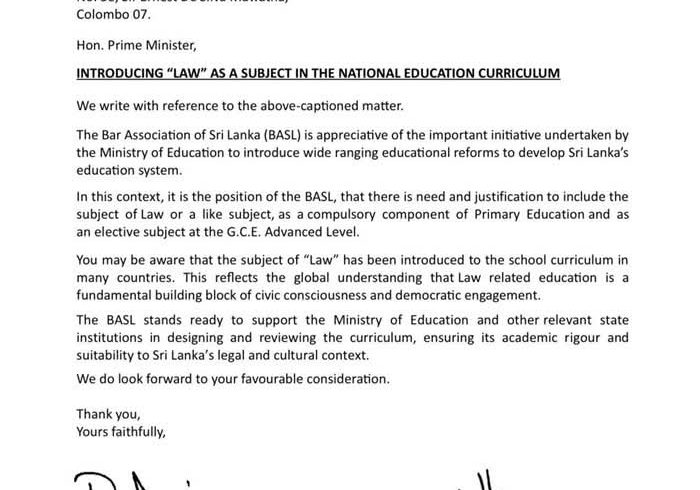 கல்வி அமைச்சர் ஹரிணி அமரசூரியவிற்கு அனுப்பிய கடிதத்தில், ஆரம்பக் கல்வியில் ‘சட்டம்’ அல்லது அதுபோன்ற ஒரு பாடத்தை கட்டாயப் பகுதியாகவும், உயர்தரத்தில் ஒரு விருப்பத் தெரிவுப் பாடமாகவும் சேர்ப்பதற்கான தேவை மற்றும் நியாயம் இருப்பதாக BASL தெரிவித்துள்ளது.