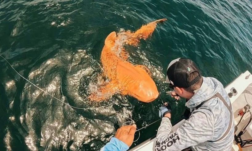கோஸ்டாரிகாவில் உள்ள டோர்டுகெரோ தேசிய பூங்கா (Tortuguero National Park) அருகே ஒரு மீனவர் அதிசயமான, பிரகாசமான ஆரஞ்சு நிற சுறா ஒன்று கண்டுபிடிக்கப்பட்டுள்ளது.