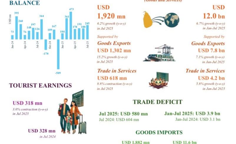 ஏற்றுமதி: 2025 ஜனவரி முதல் ஜூலை வரையான காலப்பகுதியில் மொத்த ஏற்றுமதி, வருடாந்தம் 6.7% அதிகரித்து 12.0 பில்லியன் அமெரிக்க டொலராக உயர்ந்துள்ளது. ஜூலை மாதத்தில் மாத்திரம், வர்த்தகப் பற்றாக்குறையைக் குறைக்கும் வகையில், பொருட்கள் ஏற்றுமதி மாதாந்திர சாதனையாக 1.3 பில்லியன் அமெரிக்க டொலரை எட்டியுள்ளது.