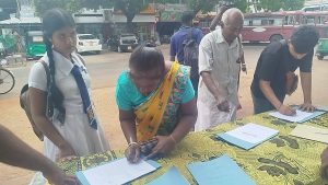 இவ் கையெழுத்து போராட்டமானது தமிழ் தேசிய கட்சிகள் மற்றும் பொது அமைப்புகளின் ஏற்பாட்டில் இடம்பெற்று வருவதோடு இன்றைய தினம் கையெழுத்து போராட்டத்தில் ஜனநாயக போராளிகள் கட்சியின் தலைவர் சி.வேந்தன் அவர்களும் மற்றும் முன்னாள் பாராளுமன்ற உறுப்பினர் சுரேஸ் பிரேமச்சந்திரன் மற்றும் பருத்தித்துறை நகர சபையினர் உப தவிசாளர் மற்றும் நகர சபை உறுப்பினர்கள் மற்றும் பருத்தித்துறை பிரதேச சபை உறுப்பினர்கள் மற்றும் பொதுமக்கள் மாணவிகள் என பலரும் கலந்து கொண்டனர்.