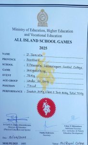 தேசியமட்டப் பாடசாலைகளுக்கிடையிலான பளுதூக்கல் போட்டியில் கலந்து கொண்ட யா/மீசாலை வீரசிங்கம் மத்திய கல்லூரி மாணவி செல்வி. ஜெ. ஜெனிற்றா 20 வயது 76 kg பிரிவில் 3ம் இடத்தைப் பெற்றுள்ளார்.