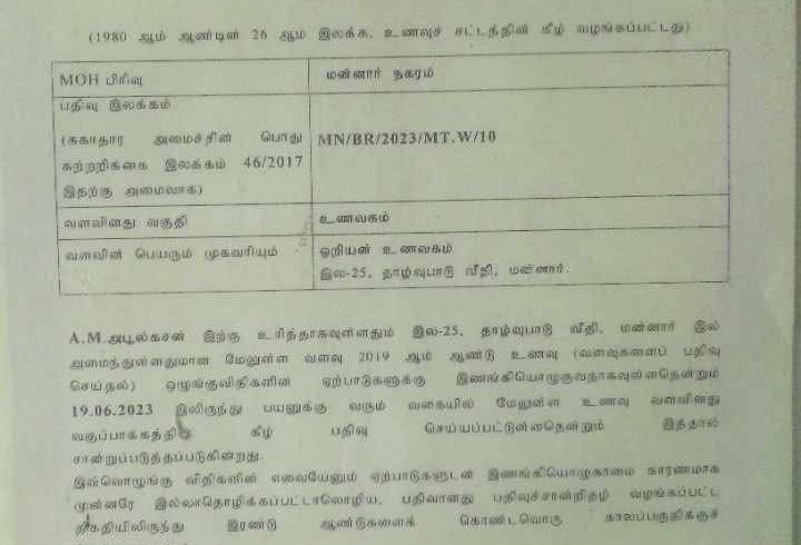 மன்னாரில் காத்தான் குடியை சேர்ந்த நபரால் நடத்தப்படும் ஹோட்டல் இரண்டு ஆண்டுகள் அனுமதி நிறைவு பெற்ற பின்னும் அனுமதி புதுப்பிக்கப்படாமல் நடத்தப்படுகிறது