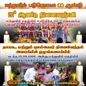முல்லைத்தீவு மாவட்டத்தின் மந்துவில் சந்தியில் 15.09.1999அன்று படுகொலை செய்யப்பட்ட 24 பொதுமக்களின் நினைவு நிகழ்வானது மிகவும் உணர்வுபூர்வமாக இன்று நடைபெற்றது.