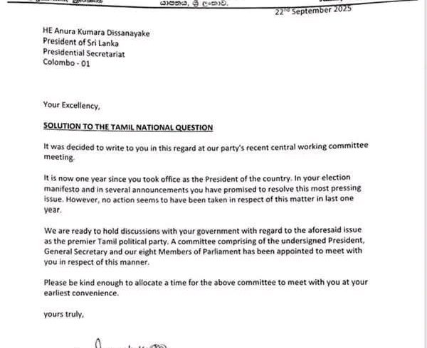அத்துடன், முதன்மையான தமிழ் அரசியல் கட்சியாக, தேசிய இனப்பிரச்சினை தொடர்பாக அரசாங்கத்துடன் கலந்துரையாடுவதற்கு தாங்கள் தயாராக உள்ளதாகவும் இலங்கை தமிழரசுக் கட்சி அந்தக் கடிதத்தில் குறிப்பிட்டுள்ளது.
