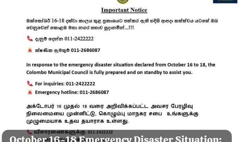 கொழும்பு மாநகர சபை தனது இணையத்தளத்தில், “ஒக்டோபர் 16 முதல் 18 வரை அறிவிக்கப்பட்டுள்ள அவசரகால அனர்த்த சூழ்நிலைக்கு பதிலளிக்கும் வகையில், கொழும்பு மாநகர சபை உங்களுக்கு உதவ முழுமையான தயார் நிலையில் உள்ளது” என்று தெரிவித்துள்ளது.