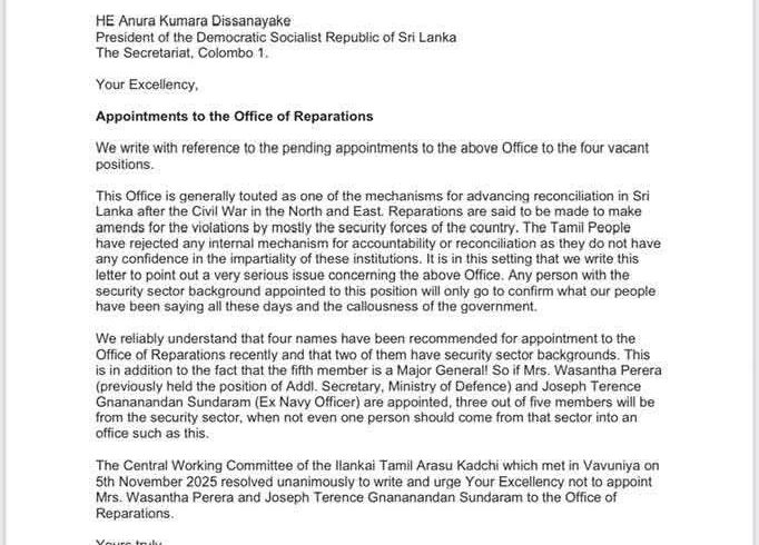 2025 நவம்பர் 5 அன்று வவுனியாவில் கூடிய இலங்கைத் தமிழரசுக் கட்சியின் மத்திய செயற்குழு ஒருமனதாக தீர்மானித்து, தங்களுக்கு திருமதி வசந்தா பெரேரா மற்றும் ஜோசப் டெரன்ஸ் ஞானநந்தன் சுந்தரம் ஆகியோரையும் இழப்பீடு செய்யும் அலுவகத்திற்கு நியமிக்க வேண்டாம் என்று வலியுறுத்தி எழுத ஒருமனதாக தீர்மானம் மேற்கொண்டுள்ளோம்.