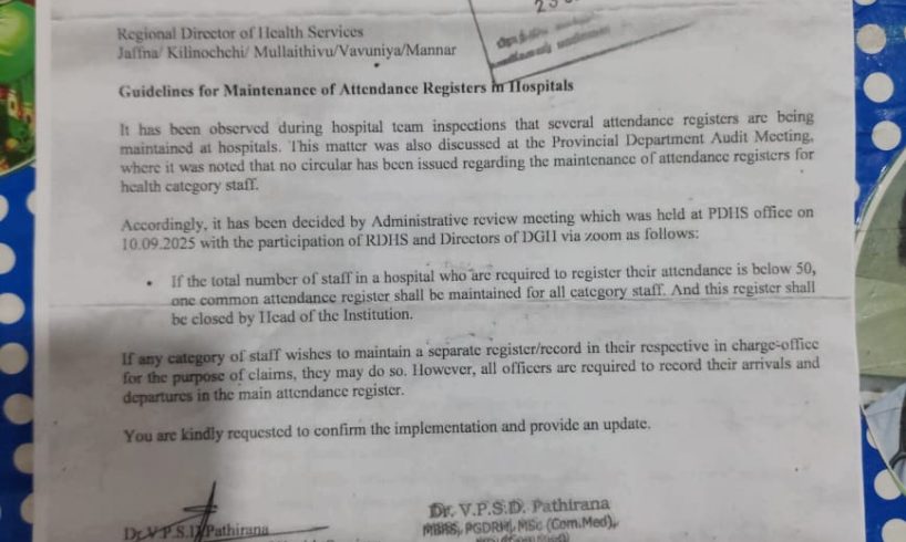 “வடக்கு மாகாணத்தைத் தவிர ஏனைய மாகாண சபைகளிலோ அல்லது மத்திய அரசாங்கத்தின் சுகாதார நிறுவனங்களிலோ இத்தகைய நடைமுறை அமுலில் இல்லை. வடக்கு மாகாணத்தில் மாத்திரம் இது தன்னிச்சையாக அமுல்படுத்தப்படுவது பாரதூரமான பிரச்சினையாகும்.”