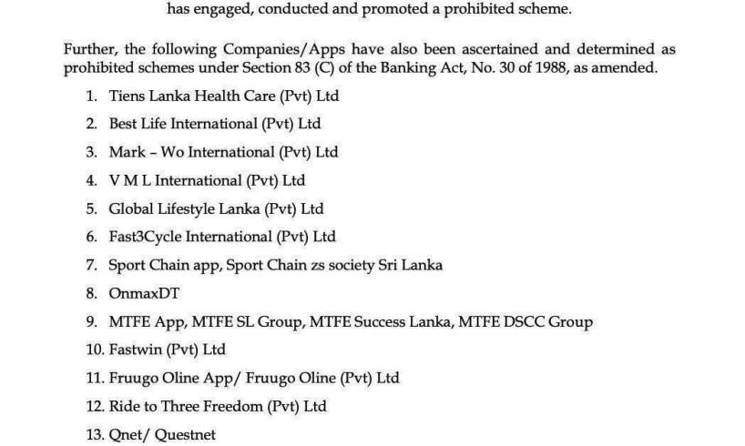 இலங்கை மத்திய வங்கி, வங்கிச் சட்டத்தின் 83(C) பிரிவின் கீழ் 22 நிறுவனங்கள் மற்றும் மொபைல் செயலிகளைத் தடை செய்யப்பட்ட ‘பிரமிட்’ திட்டங்கள் (Pyramid Schemes) என அறிவித்துள்ளது.