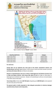வடக்கு, வடமத்திய, மத்திய, வடமேற்கு மாகாணங்கள்: விட்டுவிட்டு மழை மற்றும் இடியுடன் கூடிய மழை பெய்யும். சில இடங்களில் 100 மி.மீ இற்கும் அதிகமான கனமழை பெய்ய வாய்ப்புள்ளது.