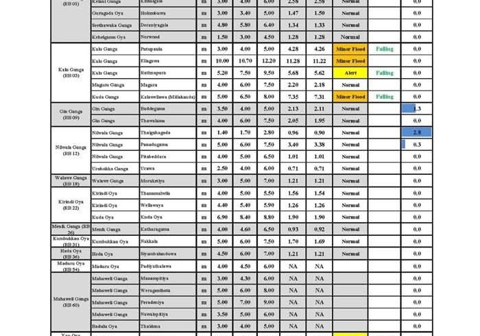 நீர்ப்பாசனத் திணைக்களம் இன்று (திங்கட்கிழமை) காலை 9.30 மணி நிலவரப்படி, களனி ஆற்றின் நாகலகம் வீதிப் பகுதியில் நீர்மட்டம் கடந்த மூன்று மணி நேரமாக 8.45 அடியில் நீடித்து, மேலும் அதிகரிக்கவில்லை என்று தெரிவித்துள்ளது.