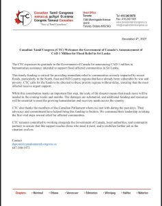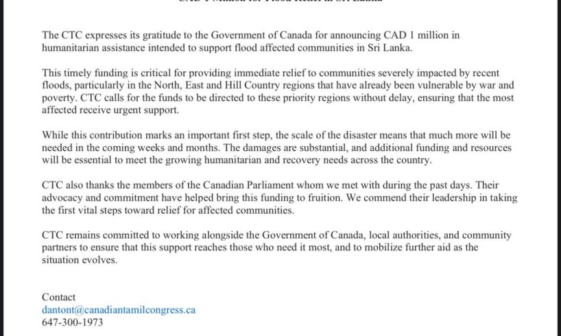 ஒட்டாவா – இலங்கையில் வெள்ளத்தால் பாதிக்கப்பட்ட மக்களுக்கு உதவுவதற்காக, கனடா அரசாங்கம் 1 மில்லியன் கனேடிய டொலர் (CAD 1 Million) மனிதாபிமான உதவியை அறிவித்துள்ளதை கனேடியத் தமிழ் காங்கிரஸ் (CTC) வரவேற்றுள்ளது.