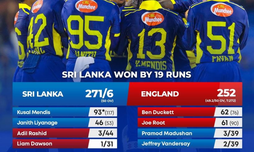 இன்று (22) கொழும்பு ஆர். பிரேமதாச சர்வதேச கிரிக்கெட் மைதானத்தில் இடம்பெற்ற, இங்கிலாந்துக்கு எதிரான முதலாவது, ஒரு நாள் சர்வதேச கிரிக்கெட் போட்டியில் (ODI) இலங்கை அணி 19 ஓட்டங்களால் வெற்றியீட்டியுள்ளது!!!