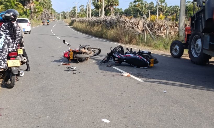 அதில் ஒரு மோட்டார் சைக்கிளில் பயணித்த மருதங்கேணி பிரதேச செயலக கணக்காளரும் சக உத்தியோகஸ்தரும் பயணித்துள்ளனர். மற்றைய மோட்டார் சைக்கிளில் ஓட்டியான பிறிதொரு நபருமாக மூவர் படுகாயமடைதுள்ளனர்.