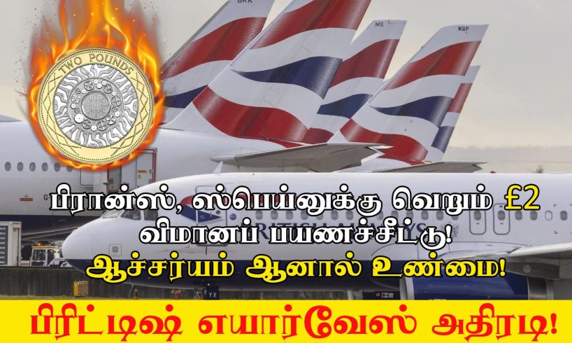 பிரிட்டிஷ் எயார்வேஸ் (British Airways) விமானத்தில் பிரான்ஸ் (France), ஸ்பெய்னுக்குப் (Spain) பயணம் செய்ய வெறும் 2 பவுண்டுகள் மட்டும் செலுத்தினால் போதும் என்ற அறிவிப்பு வெளியாகியுள்ளது.