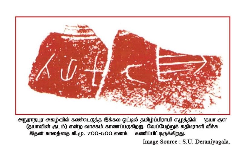 இலங்கையில் அனுராதபுரம் மாவட்டத்தில் சல்கஹவத்த என்னும் இடத்தில் சிராண் தெரணியகல என்னும் சிங்கள தொல்லியல் ஆய்வாளரினால் மேற்கொள்ளப்பட்ட அகழாய்வில் சில பிராமி எழுத்துக்கள் பொறிக்கப்பட்ட பானை ஓடுகள் கிடைக்கப்பெற்றது.
