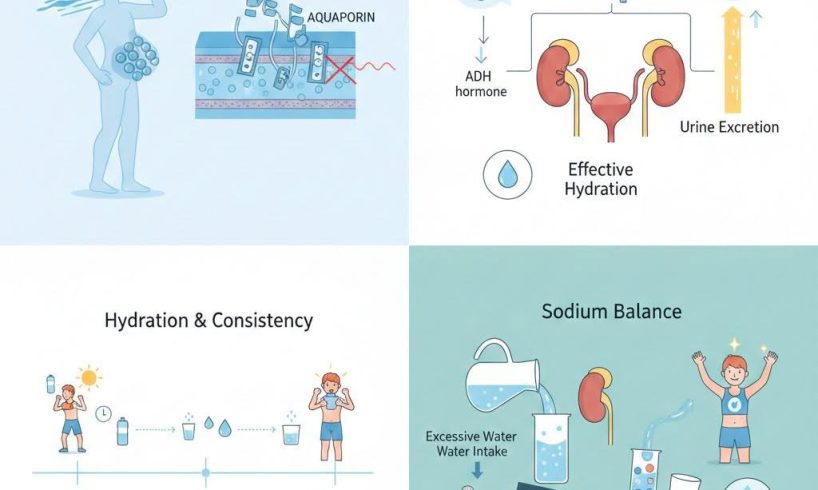 உடலில் நீர் உறிஞ்சப்படுவது அக்வாபோரின்கள் (Aquaporins) எனப்படும் சிறப்பு புரதக் கால்வாய்கள் உட்பட பல வழிமுறைகளால் ஒழுங்குபடுத்தப்படுகிறது. “வேகமாகத் தண்ணீர் குடிப்பது அக்வாபோரின்களை நிலைகுலையச் செய்யும்” என்பது ஒரு மிகைப்படுத்தப்பட்ட கருத்தாகும்.