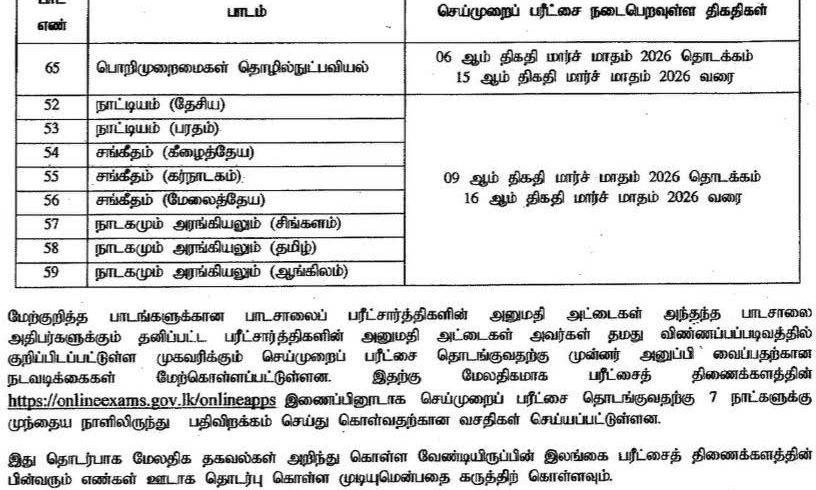 நாட்டியம் (தேசிய), நாட்டியம் (பரதம்), சங்கீதம் (கீழைத்தேய), சங்கீதம் (மேலைத்தேய), நாடகமும் அரங்கியலும் (சிங்களம்), நாடகமும் அரங்கியலும் (தமிழ்), நாடகமும் அரங்கியலும் (ஆங்கிலம்) ஆகிய பாடங்களுக்கான செய்முறைப் பரீட்சை எதிர்வரும் மார்ச் 09ஆம் திகதி முதல் 16 ஆம் திகதி வரை நடைபெறும் என இலங்கை பரீட்சைகள் திணைக்களம் குறிப்பிட்டுள்ளது.