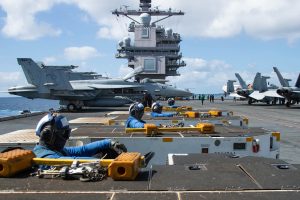 USS Gerald R. Ford கப்பல் சுமார் 100,000 டொன் எடையுடைய அணுசக்தி இயங்கும் போர் கப்பலாகும். இதில் F/A-18 Super Hornet உள்ளிட்ட பல முன்னேற்றமான போர் விமானங்கள் தரையிறங்கவும் பறக்கவும் வசதி உள்ளது.