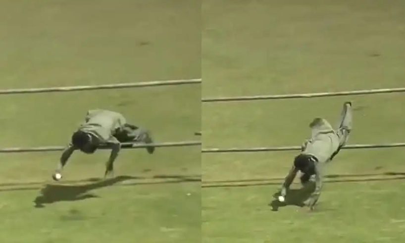 போட்டியின் போது பேட்ஸ்மேன் அடித்த பந்து சிக்ஸருக்குப் பறக்க, அதைப் பிடிக்க கேலரியில் இருந்த ரசிகர் ஒருவர் மின்னல் வேகத்தில் முன்னேறி வந்து, மரத் தடுப்புகளுக்கு இடையே தலைகுப்புற விழுந்து ஒரு அபாரமான ‘டைவிங்’ கேட்சைப் பிடித்தார்.