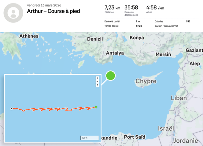 இந்த பதிவில் உள்ள GPS தகவல்களை ஆய்வு செய்த Le Monde, அந்த ஓட்டம் நடந்த இடம் சாதாரண பகுதி அல்ல என்று கண்டுபிடித்தது. அது பிரான்ஸின் முக்கியமான விமான தாங்கி போர் கப்பல் ஆன Charles de Gaulle aircraft carrier மேல் நடந்தது என்பது உறுதியாகியது.